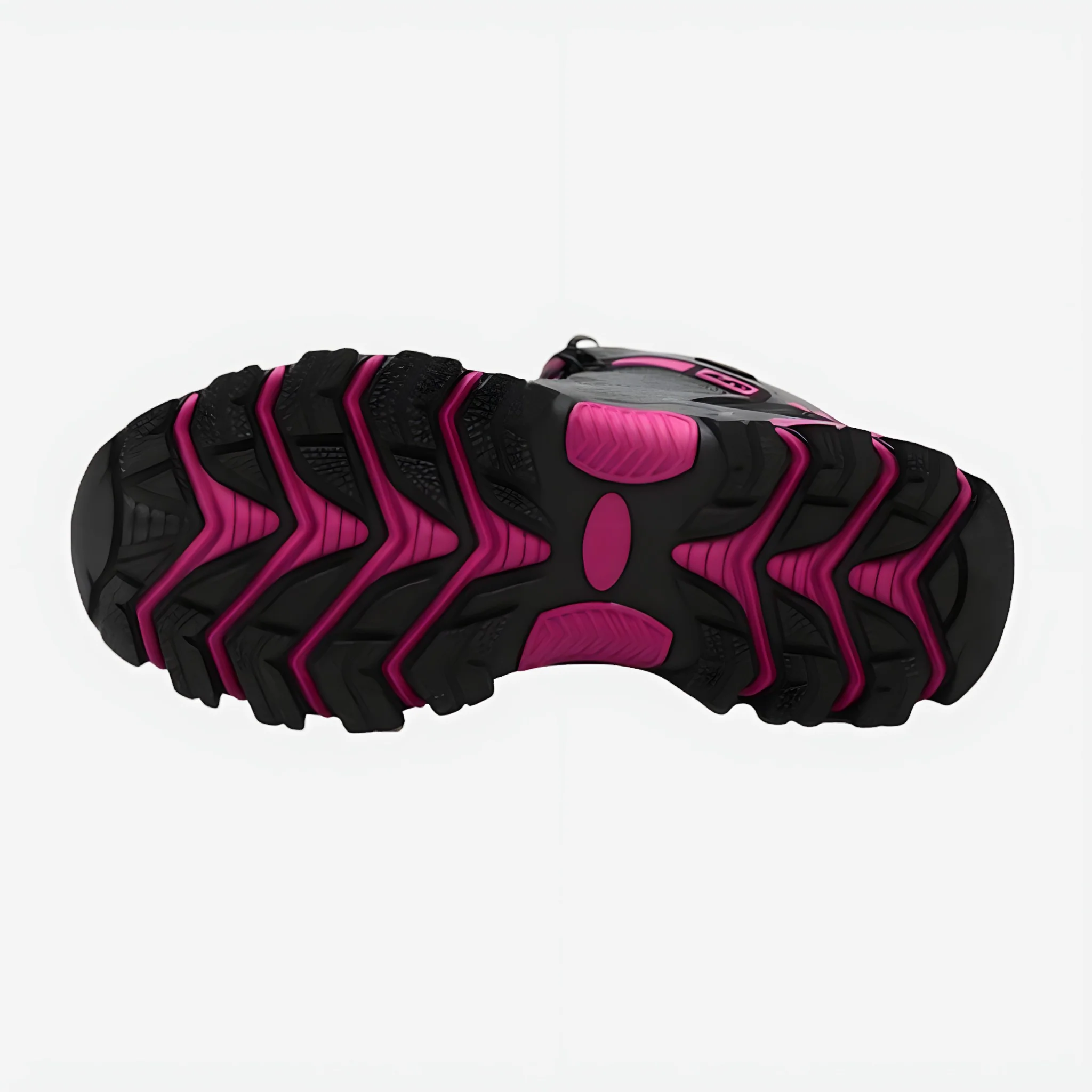 Chaussures de randonnée femme – Coloris gris et rose. Matériaux respirants avec protection contre l’humidité. Semelle adhérente pour tous types de terrains. Support renforcé à la cheville. Disponibles du 34 au 44. Adaptées aux sentiers de montagne.